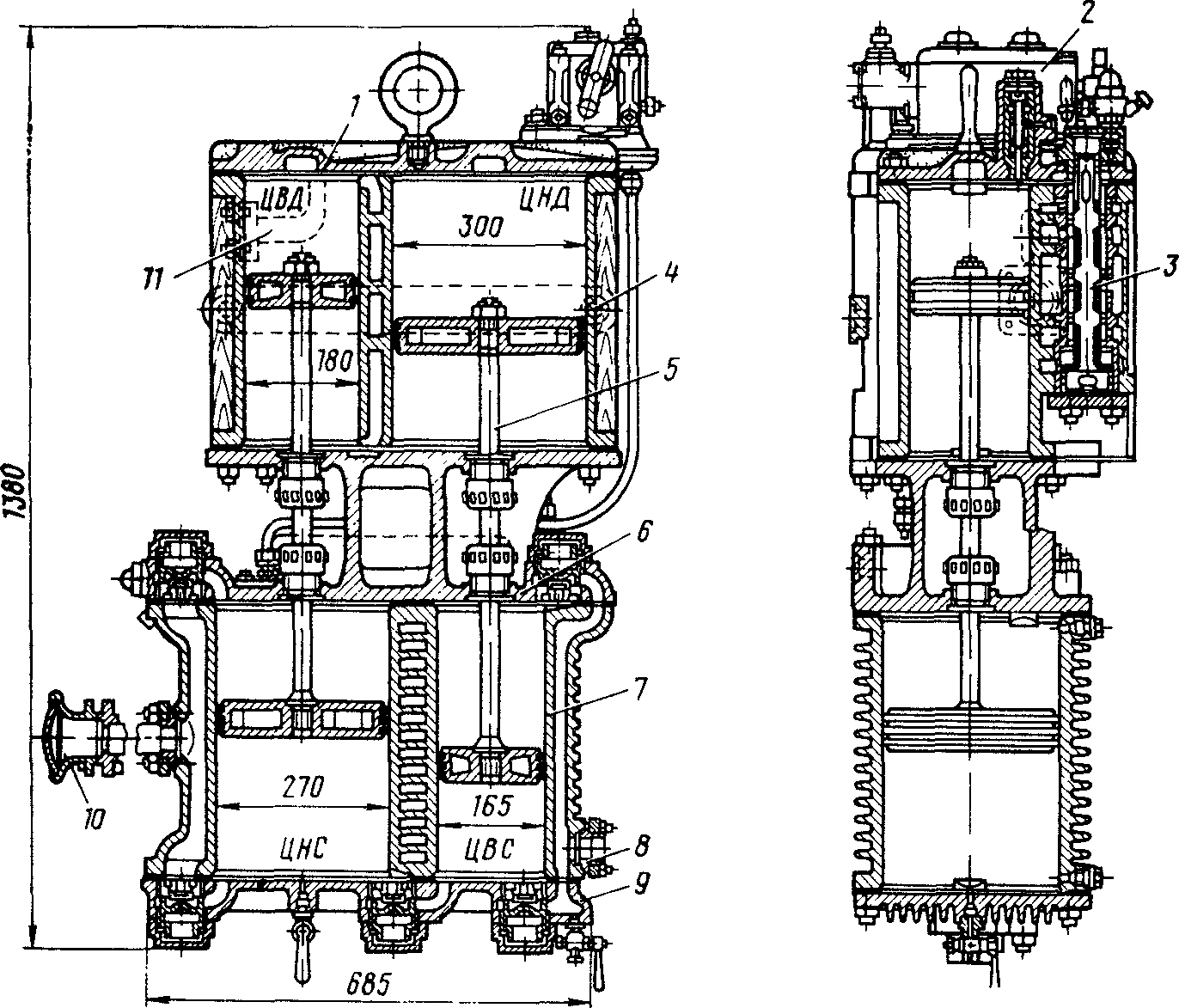 تين. 4. مضخة Knorra المركبة ، نوع P: 1 - غطاء ببكرة متغيرة ، 2 - حلمة شحم: 3 - بكرة رئيسية ؛ 4 - كتلة اسطوانات البخار. 5 - قضيب مع مكابس. 6 - جزء وسيط مع موانع تسرب الزيت والصمامات ؛ 7 - كتلة اسطوانات الهواء. 8 - تفرع إلى الخزان الرئيسي ؛ 9 - تغطية بالصمامات. 10 - مرشح الشفط ؛ 11 - فرع أنبوب إمداد البخار الجدول 3. أبعاد مضخات الهواء البخاري