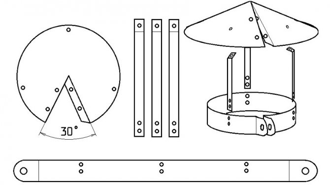 - أولاً ، على لوح معدني بعلامة دائمة ، نحدد الأجزاء المستقبلية: مشبك للتثبيت على الأنبوب ، وثلاثة أرجل للتثبيت وغطاء مظلة. نقطعها بمقص للمعادن.