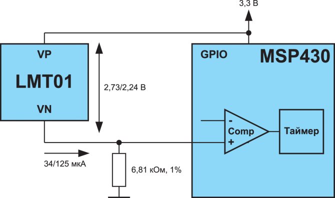 كما هو مذكور أعلاه ، لنقل نتيجة القياس ، يولد LMT01 تسلسل بت في شكل نبضات العد الحالية. لهذا ، يتطلب المستشعر اثنين فقط من الخيوط (الشكل 4). لتحويل النبضات الحالية إلى الشكل المألوف للدوائر الرقمية الدقيقة ، يمكنك في بعض الحالات استخدام مقاوم واحد (ولكن ليس دائمًا - أكثر من ذلك أدناه).