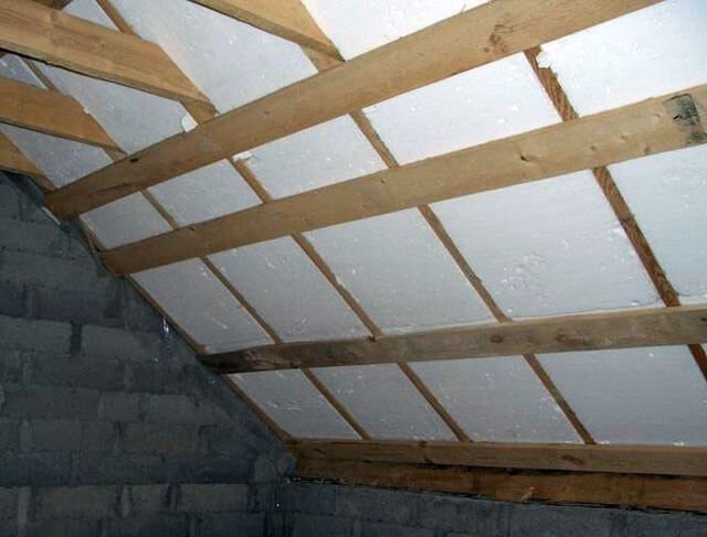 لعزل السقف بين العوارض الخشبية ، لا يتم استخدام مواد رغوة البلاطة ، حيث يصعب قطع المواد بوضوح وفقًا لحجم الخلية. الفجوات المحتومة ستصبح جسور باردة. بالإضافة إلى ذلك ، إذا لم يتم تجميع العوارض الخشبية وفقًا لحجم المادة ، فسيكون هناك الكثير من النفايات عند القطع.