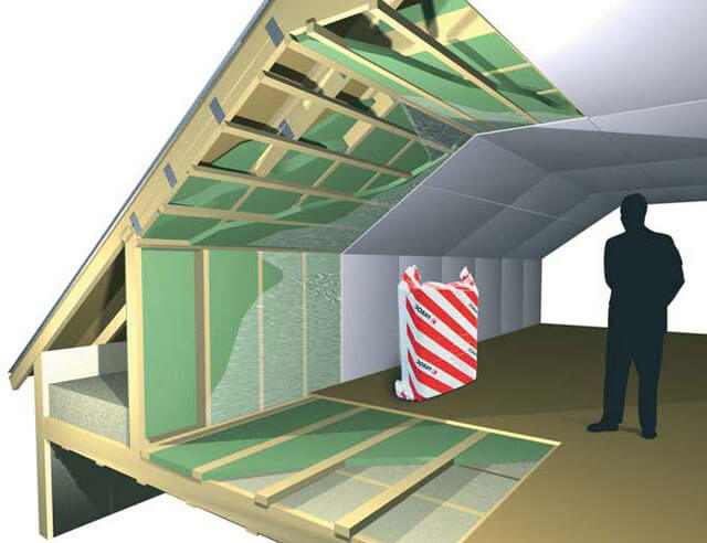 إذا لم يكن من المفترض استخدام مساحة العلية كمساحة معيشة ، فإن مخطط العزل هذا ليس مناسبًا تمامًا ، لأنه في هذه الحالة من الضروري عزل مساحة العلية عن طريق وضع العزل على أرضية العلية.