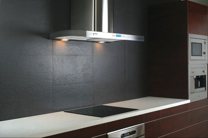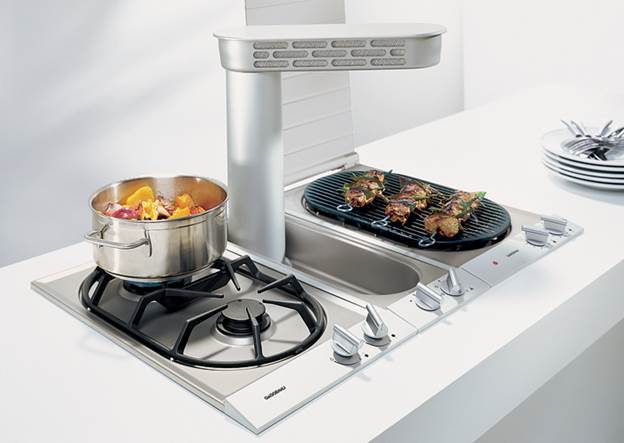 - Domino kapuce. Moderní typ digestoře, namontovaný přímo za kamny na pracovní ploše. Během vaření se digestoř pohybuje nahoru, kolmo ke sporáku. Nevýhodou tohoto designu je jeho vysoká cena. U velké kuchyně je navíc bezpečnější zvolit výkonnější a objemnější variantu.