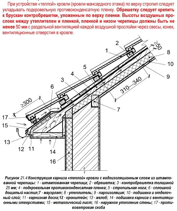 Existuje verze kombinované (mansardové) střechy, ve které se jako střešní fólie používá parotěsná hydroizolace nebo parozábrana. V tomto případě je však nutné zajistit účinné větrání prostoru nad i pod fólií, celková výška větracích mezer dosáhne 10 cm. Toto řešení je účinné, ale komplikuje design a používá se jen zřídka. Pamatujte, že podstřešní fólie (4), blíže k převisu, je vyvedena přes ocelovou zástěru (15), a to do okapu okapového systému. To by mělo být vždy provedeno, aby se zajistilo vytékání kondenzátu ze střešní konstrukce.