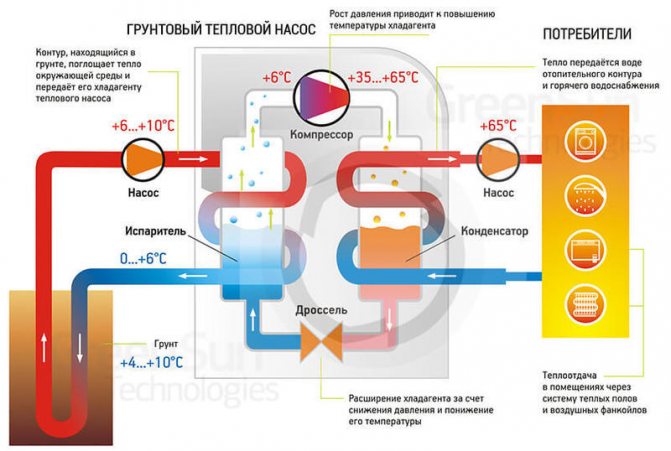 Speciálně navržené tepelné čerpadlo pro vytápění domu je instalováno na povrchu a výměník tepla je namontován v zemi nebo na dně nádrže. Tepelná energie je „odčerpávána“ na povrch a umožňuje vám ohřívat chladicí kapalinu v topném okruhu domu nebo nebytového zařízení.
