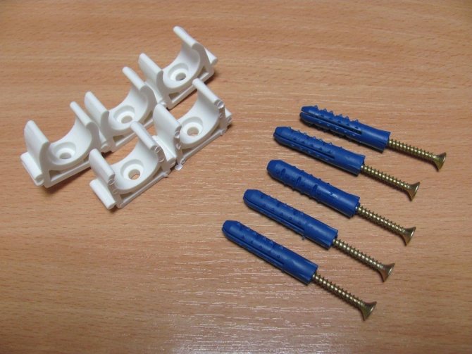 - Prvním krokem je označení trasy budoucího potrubí po obvodu. Mějte na paměti, že by měl být instalován s mírným sklonem - tímto způsobem vylučujete možnost zamrznutí vody v potrubí i v nevytápěné místnosti (například ve venkovském domě) .Pomocí vrtačky musíte vytvořit otvory pro hmoždinku - hřebíky. Do otvorů předem připravené upevňovací spony pro polypropylen Vložíme hmoždinku do otvoru kladivem a šroubovákem. Konečnou fází práce je instalace trubek do spon.