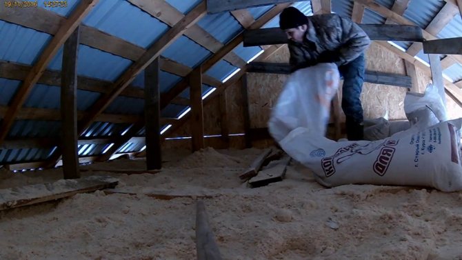 Povaha a první fáze těchto prací jsou stejné jako v případě pilin. Po přípravě povrchu se vata položí, praskliny a díry se vyfouknou (velké je třeba utěsnit) a poté se to všechno pokryje filmem. Nahoře můžete položit desky nebo udělat potěr.