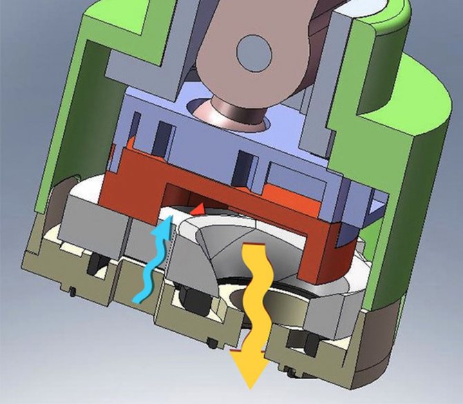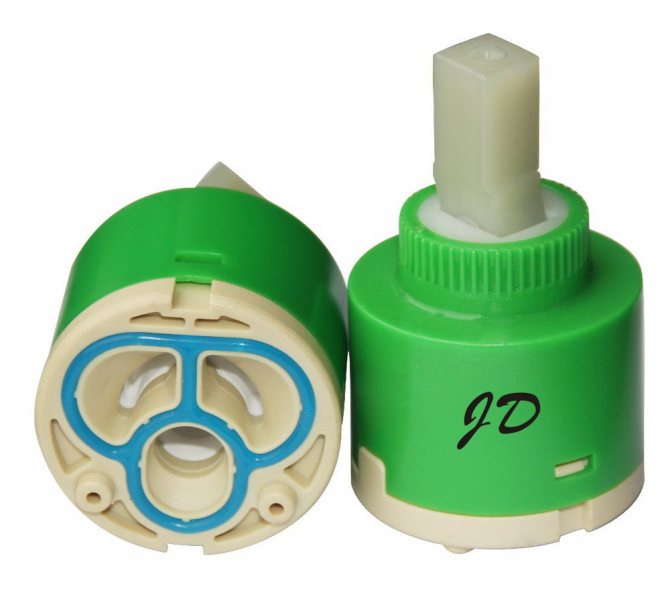 Die scheibenförmige Patrone hat eine zylindrische Form mit drei Löchern am Boden (2 Einlässe und ein Auslass). Im Inneren des Zylinders befinden sich zwei Keramikscheiben in engem Kontakt miteinander. Einer von ihnen ist bewegungslos und befindet sich unten. Die obere Scheibe wird von einer Stange angetrieben, die mit dem Einstellgriff des Mischers verbunden ist.