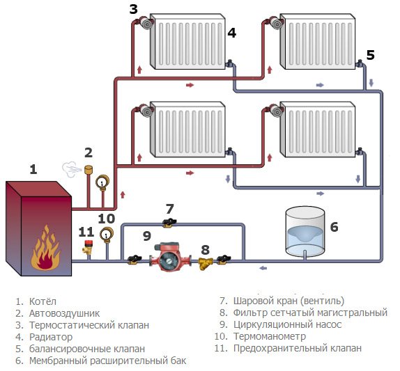 La principale différence avec le schéma gravitationnel est que le liquide (eau ou antigel) s'écoule de la chaudière vers les batteries et retourne pas en raison de la différence de température et de pression, mais à l'aide de pompes.