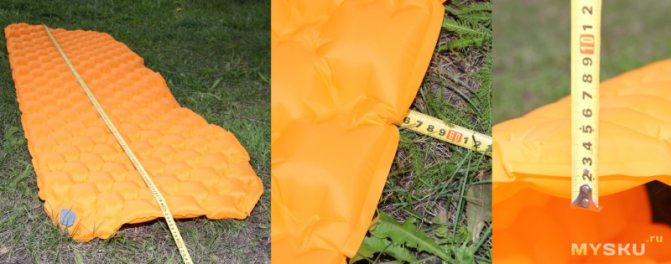 En ce qui concerne le poids, le matelas a un net avantage sur un tapis autogonflant et est légèrement inférieur à la mousse. Le poids du matelas dans la housse est de 510 grammes. Le poids du tapis auto-gonflant dans un sac est de 1082 grammes, le poids de la mousse est de 381 grammes.
