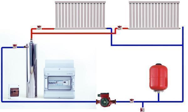 Dvije su cijevi pričvršćene na tijelo. Jedan od njih opskrbljuje bojler hladnom rashladnom tekućinom, a drugi odaje zagrijanu vodu. Unutrašnjost kućišta u potpunosti je ispunjena zagrijanim elementom. Krajevi se mogu zatvoriti komadima čelične mreže.
