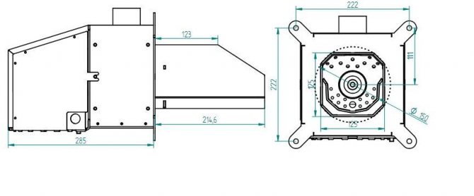 Za okretanje mehanizma trebaju vam ležajevi, motor s malim brojem okretaja (električni) i mjenjač. Puhalo zraka može se kupiti u trgovini. Fiksira se na plastiku, u kojoj je mjesto već pripremljeno. Ploča je izrađena na temelju crteža. Konfiguracija ovisi o samim vratima kotla. Crtež plamenika može se vidjeti na ovoj fotografiji.