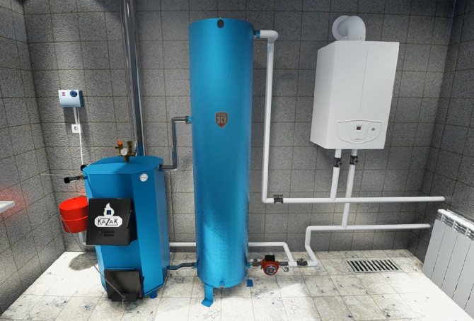 - treća opcija je upotreba tampon spremnika kako bi se održala temperatura rashladne tekućine. U ovom je slučaju kotao na kruto gorivo povezan prema standardnoj shemi, a upotreba plinskog kotla omogućuje radijatore grijanja u međuspremniku - to traje od 2 do 4 sata.