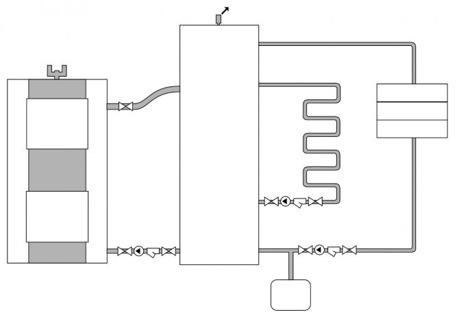 Prema ovoj shemi, rashladna tekućina zagrijava samo vodu u kotlu, a sam sustav opskrbe vodom do 2. kruga bit će zatvoren. To omogućuje značajno povećanje trajnosti uređaja s dvostrukim krugom, koji jako pati od zalijepljene tvrde vode.