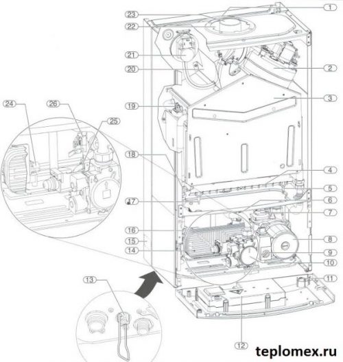 1 - ekspanzijski spremnik 2 - turbina 3 - bunker za izgaranje ispušnih plinova 4 - atmosferski plamenik 5 - elektroda za paljenje plinskog plamenika 6 - sigurnosni ventil za nadtlak 7,8 - crpka s automatskim odzračivanjem 9 - prekidač brzine pumpe 10 - dovod plina 11 - manometar 12 - upravljačka ploča rada kotla 13 - napajanje kotla 14 - sekundarni izmjenjivač topline 15 - naljepnica sa serijskim brojem 16 - prekidač tlaka 17 - osjetnik upravljanja plamenom 18 - osjetnik temperature polaza 19 - osjetnik temperature kruga grijanja u nuždi 20 - pregrada zraka - prekidač diferencijalnog tlaka 22 - protok zraka u kotlu 23 - emisija ispušnih plinova 24 - osjetnik temperature PTV-a 25 - ventil za smanjenje tlaka u krugu PTV-a 26 - mjerač protoka PTV-a