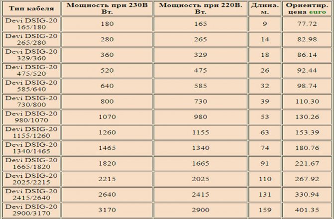 - Deviflex DTIP - dvožilni kabel izoliran PVC-om, može se koristiti i u zatvorenom (za ugradnju cjelovitog sustava grijanja) i na otvorenom (na rampama, stepenicama), snage 10 ili 18 W / m. Dolazi u trgovine u uvalama različitih duljina, segment od 10 m košta od 3100 rubalja;