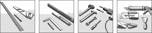 | Pila za rezanje, čelični ravnalo, nož | B Kutomjer, libela, metar, olovka | B Obični i gumeni čekić, električna bušilica, ključ, odvijač | D Šprica za brtvljenje, gleterica, lopatica |