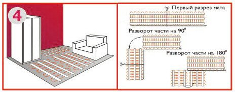 | 4) prostirka je postavljena kabelom prema gore prema prethodno označenom planu i pričvršćena je na podnožje poda. Važno je napomenuti da se ne preporučuje korištenje iste grijaće mreže za grijanje poda u različitim vrstama soba i s različitim podnim oblogama. Prilikom rezanja polimerne mreže radi promjene smjera prostirke, oštećenje kabela nije dopušteno. Kabel se ne smije prelaziti, jer će to izravno dovesti do pregrijavanja i kvara cijelog sustava. Preporučljivo je držati razmak između dijelova kabela jednakim razmaku s kojim je položen na mrežu. Također je potrebno uzeti u obzir udubljenje od zidova do kabela - 5 cm ili više cm. I udubljenje od ostalih uređaja za grijanje, namještaja, kućanskih aparata - 10 cm. Pri postavljanju prostirke važno je da osjetnik temperature je na istoj udaljenosti od susjednih dijelova kabela. |