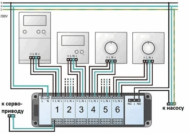 Prije instaliranja servoa, odlučite s kojom vrstom termostata će uređaj morati komunicirati. U slučajevima kada termostat kontrolira rad jednog vodenog kruga, oba su uređaja izravno povezana žicama. Kada je riječ o upotrebi višezonskog termostata, uređaja koji opslužuje nekoliko cjevovoda odjednom, servo motori su povezani na sljedeći način.