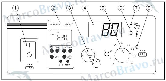 1. Glavni prekidač 2. Tjedni timer 3. Ručni gumb 4. Zaslon 5. Regulator temperature 6. Signalna lampica (temperatura saune) 7. Signalna lampica (vrijeme uključivanja) 8. Signalna lampica (uključena pećnica)