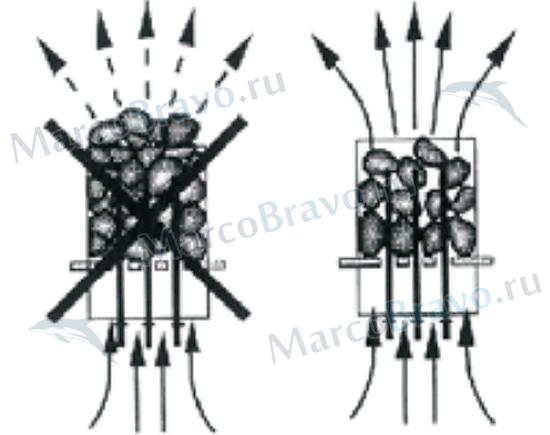 Za štednjak su prikladni kamenovi promjera 4-8 cm, u koje se mogu stavljati samo kamenje posebno dizajnirano za tu svrhu. U tom slučaju kamenje mora u potpunosti prekriti grijaće elemente, ali bez stvaranja dijapozitiva. Kamenje je složeno uredno i ne jako čvrsto kako ne bi ometalo cirkulaciju zraka u pećnici. Ako veliko kamenje ne stane između grijaćih elemenata, nemojte ih upotrijebiti silom. Ne smiju se koristiti lagani, porozni i keramički kamenčići iste veličine. Zabranjeno je paliti štednjak bez kamenja. To bi moglo dovesti do požara.