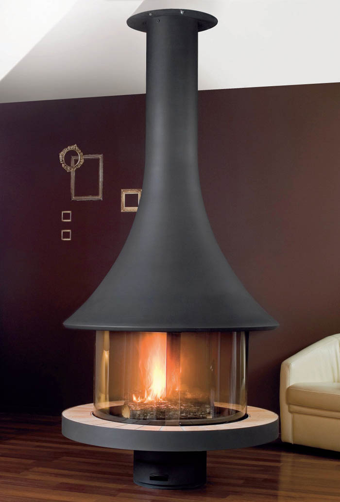 Kamin postavljen u sredini vizualno se razlikuje po boji ili završnoj obradi i oko njega su postavljeni glavni dijelovi namještaja.