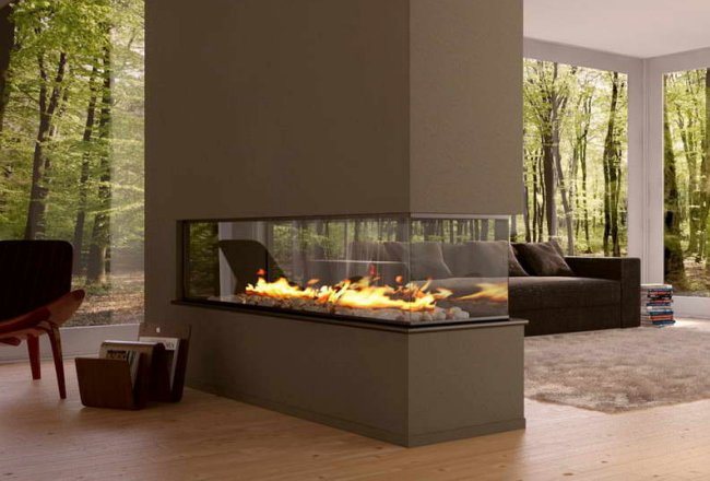Korištenje vatrostalnog stakla u dizajnu kamina daje im veliku važnost. Zahvaljujući prozirnosti ognjišta stvara se efekt žive slike, samo apsolutno siguran, isključujući pojavu požara. Obično stakleni kamin nije opremljen dimnjakom, pa možemo izvući zaključak o vrsti goriva na kojem radi.