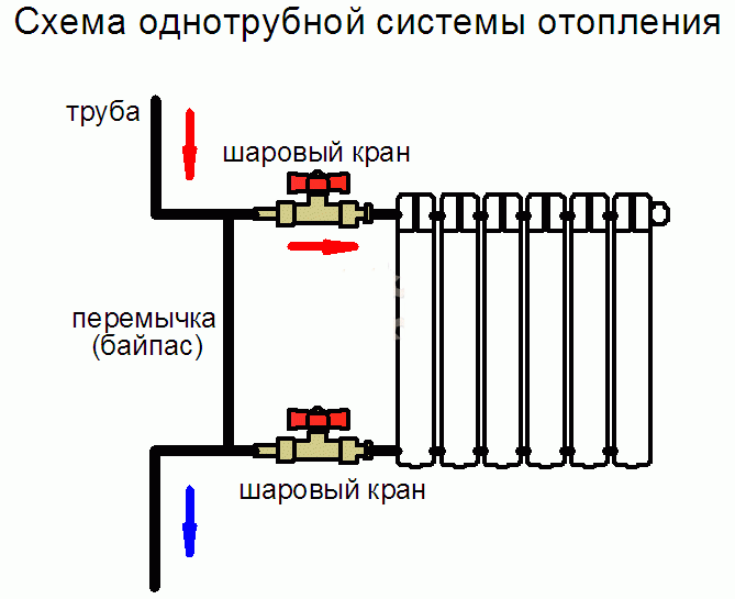 - Najčešće su jednostrane veze. Pogonska cijev je spojena na vrh radijatora, a izlazna cijev na dno radi optimalnog zagrijavanja. Ako se vruća voda napaja odozdo, pogonska cijev je spojena na donji priključak. Kao rezultat, prijenos topline smanjuje se u prosjeku za 6%. Jednostrana veza omogućuje vam ugradnju kratkospojnika između ulaznih i izlaznih cijevi - zaobilaznica. Takav prijelaz, u kombinaciji s ventilima koji prekidaju dovod vode u radijator, omogućuje vam regulaciju količine topline u sobi i ugradnju cijevi bez isključivanja glavnog sustava grijanja.