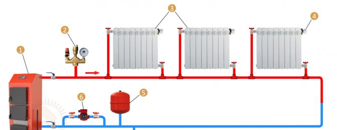 Egycsöves fűtési rendszer kényszerkeringéssel: 1 - fűtőkazán; 2 - biztonsági csoport; 3 - fűtőtestek; 4 - Mayevsky daru; 5 - tágulási tartály; 6 - cirkulációs szivattyú; 7 - lefolyó