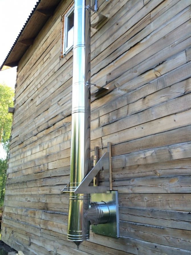 2. lépés. Oldja meg a kémény kérdését. Javasoljuk, hogy több okból ne vegye ki a tetőre. Először is, nincs szükség elég összetett és időigényes munkára a mennyezet és a tető tűzbiztonságának biztosításához. Másodszor, a tetőn lévő további "lyukak" jelentősen növelik a szivárgás valószínűségét ezeken a helyeken. Harmadszor, sokkal drágább és bonyolultabb, különféle kiegészítő elemeket igényel a tetőfedéshez, az adott anyagtól függően. Javasoljuk, hogy a kéményt vigye át a falon - gyorsan, olcsón és megbízhatóan.