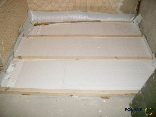לאחר שהמשטח מתייבש, מסגרת עץ מותאמת אליו. המרחק בין הקורות נתון לשיקולכם, אך עדיף שהוא לא יעלה על 80 ס"מ. על בסיס זה מכוסה סרט ומקובע בעזרת מהדק. החלל בין הקורות מלא בחומר מבודד חום.