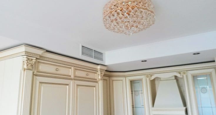 Optienummer 5 - maskeren van het luchtkanaal in het uitstekende deel van het verlaagde plafond. Effectief, maar als u bij de buis moet komen, moet u het plafond demonteren en opnieuw installeren. Niet zonder de hulp van specialisten die moeten betalen.