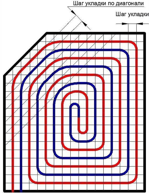 Er is ook de aanduiding "spiraal" of "schaal". In een dergelijk schema wordt het temperatuurveld gelijkmatiger over het vloeroppervlak verdeeld, omdat de leidingen van het directe en omgekeerde circuit afwisselend worden gelegd.