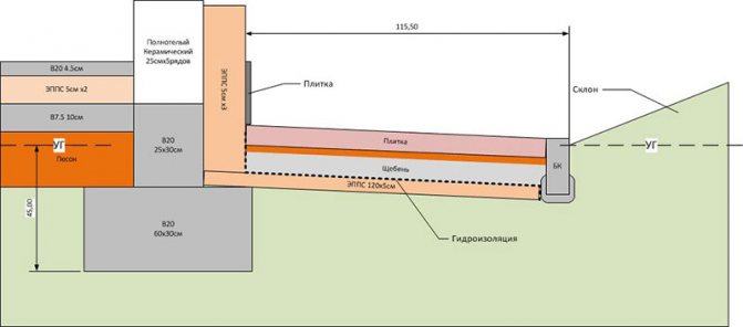 Uiterlijk is het blinde gebied een brede strook die grenst aan de structuur en deze langs de omtrek omgeeft. Het is gemaakt onder een kleine hoek (5-10 graden) vanaf de fundering - zo stroomt water op voldoende afstand van de muren van het huis in de omliggende grond (of afvoergoot). De bescherming van de fundering beperkt zich echter niet tot de buitenste laag, maar heeft een gelaagde structuur en gaat tot een diepte van 25 cm tot een halve meter. Het aantal, de dikte en de soorten lagen is afhankelijk van de klimaatzone en de grondsoort. Naast de coating en het beddengoed zijn ook drainage, extra waterdichting en isolatie van het blinde gebied aangebracht.