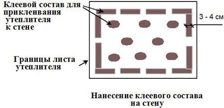 - Breng lijm aan op de plaat met een doorlopende strook van 10 cm breed rond de omtrek, stap 3 cm terug van het vierkant en drie dia's met een diameter van 20 cm in het midden. De dikte van de laag is 2 cm. Is de muur perfect vlak, dan kan de lijm over het gehele oppervlak van de isolatieplaat worden aangebracht. Eerst worden kleine porties met moeite op de juiste plaatsen gewreven, daarna wordt de hoofdlaag aangebracht.