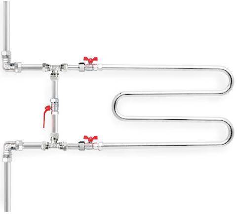 In huizen met centrale verwarming is het raadzaam om een bypass te installeren voor een verwarmde handdoekdroger, aangezien veel modellen van dit verwarmingstoestel mogelijk niet zijn ontworpen voor de parameters van onze ketelruimten. In dit geval wordt de diameter van de bypass kleiner gekozen dan de diameter van de hoofdleidingen - meestal is het een buis van een halve inch.