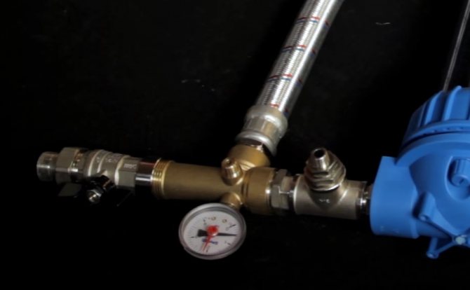 - Een veiligheidsklep is geïnstalleerd op de aftakleiding van de tank en daaronder - een afsluitklep. Door deze opstelling kan het water weglopen om de druk in de luchtkamer van het apparaat te controleren. De voegen worden afgedicht met touw of fum-tape.