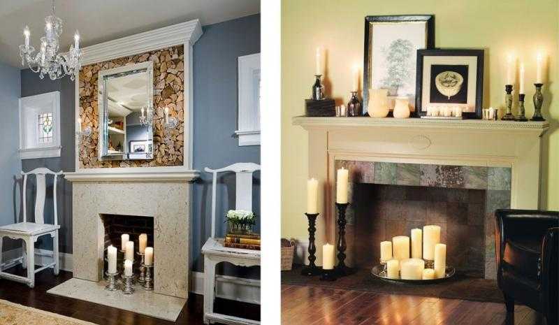 En tot slot, de decoratie van de open haard.Een klassieke open haard is niet denkbaar zonder een schoorsteenmantel, daarom wordt de structuur vaak ook aangevuld met een scharnierende plank wanneer u zelf een valse open haard maakt. Daarop heb ik allerlei accessoires die in harmonie zijn met het algehele interieur van de kamer. Extra accessoires (in de vorm van een rooster, kunstmatig brandhout, kaarsen, spiegels en andere decoratieve elementen) kunnen bovendien op de vloer bij de open haard zelf worden geplaatst.