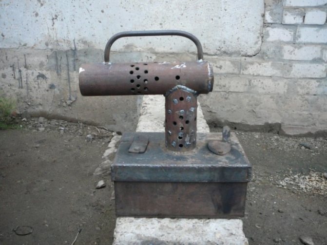 - Дизайнът се основава на газова бутилка за 50 л (отоплява стаята до 70 кв. м). В цилиндъра е потопено бутало с долна дюза.