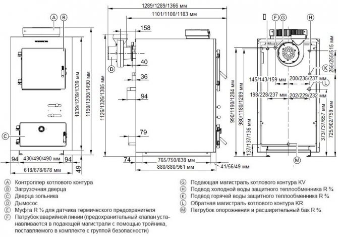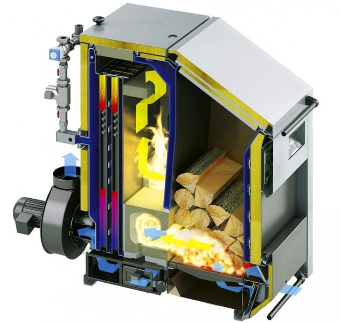 O combustível queima no fundo da câmara de combustão fechada. O segundo poço é menor, serve para a pós-combustão dos gases de combustão e para resfriá-los na caldeira para aquecimento de água para aquecimento.