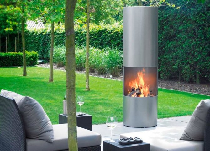 Outra vista interessante que pode ser instalada até mesmo em um gramado é uma lareira móvel.... Geralmente vem em uma forma compacta, com diferentes alturas e estilos. Às vezes, há prateleiras embutidas no pacote.