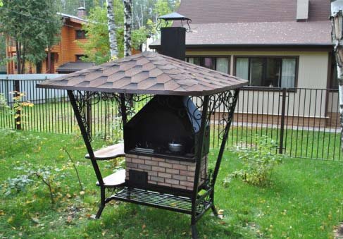 A próxima opção é criar uma lareira com churrasqueira... Essa estrutura desempenhará não apenas um papel decorativo, mas também utilitário. Poderá preparar vários pratos, sendo o mais popular o kebab aromático. Você também pode instalar um braseiro lá, mas uma opção interessante é incorporá-lo à estrutura geral.