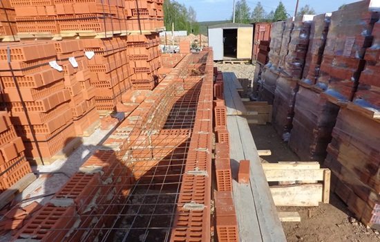 - Sobre a camada impermeabilizante da fundação são colocadas 2 a 4 camadas de alvenaria densa, nos cantos a partir dos lados da base. Cada linha é reforçada com uma malha reforçada.