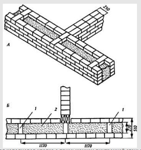 São duas paredes paralelas, entre as quais é colocada uma camada de concreto leve. Os tijolos assentados com cutelo e salientes na alvenaria proporcionam a ancoragem das paredes longitudinais com betão (na figura da esquerda 1 - tijolo; 2 - betão).