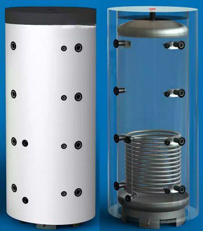 | Rezervor tampon cu schimbător de căldură intern suplimentar (de obicei sub formă de bobină). | Un dispozitiv cu un schimbător de căldură suplimentar este necesar la o presiune mai mare a unui circuit mic, ceea ce este inacceptabil pentru încălzirea radiatoarelor. Dacă un schimbător de căldură suplimentar este conectat cu o pereche separată de duze, se poate conecta o (a doua) sursă de căldură suplimentară, de exemplu, cazan TT + cazan electric. De asemenea, puteți separa lichidul de răcire (de exemplu: apă în circuitul suplimentar; antigel în sistemul de încălzire) | |