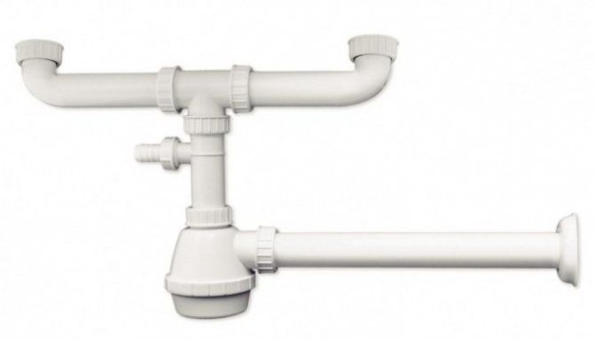 - Îndoiere duplicat. Are un sifon special conceput pentru chiuvete cu două boluri. Le selectăm canalul de scurgere cu numărul necesar de robinete. Este un astfel de dispozitiv care este afișat în fotografia de mai jos.