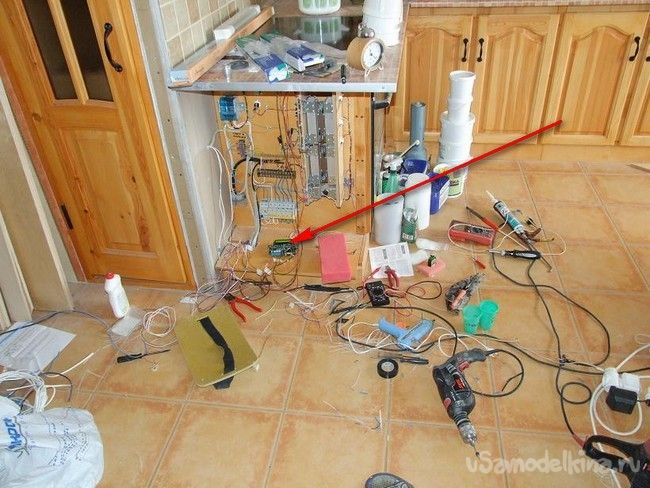 Întreaga zonă încălzită (coridor, bucătărie, baie-toaletă) consta din patru încălzitoare independente. „Încălzirea în pardoseală subțire” a fost așezată într-un strat de adeziv pentru plăci. Împreună cu fiecare rețea de încălzire, a fost montat un senzor digital de temperatură DS18B20. Toate firele erau conduse într-un dulap dedicat din bucătărie. Au existat, de asemenea, câteva componente electrice care nu au legătură cu încălzirea prin pardoseală - un bloc pentru aprinderea fără probleme a lămpilor cu halogen în baie (ca într-un teatru, fără ea aveau o resursă extrem de redusă), un RCD al unui cazan. Unitatea de control a fost echipată cu chei triac pe radiatoare puternice, o sursă de alimentare. Dulapul avea două grile de ventilație și o ușă cu încuietoare.