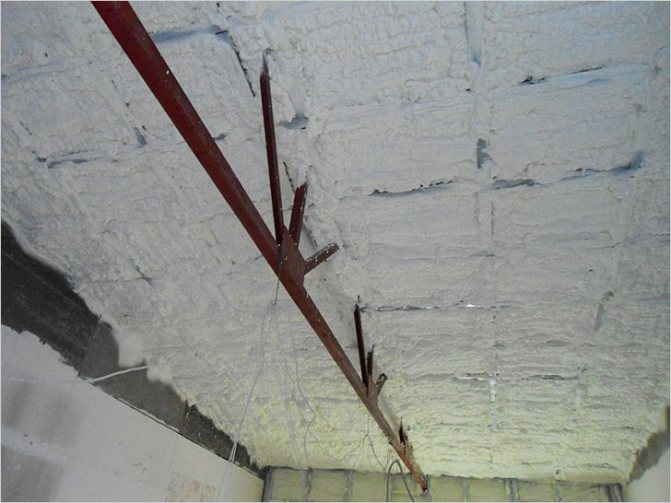 - Dacă tavanul este din lemn, atunci materialul poate fi fixat cu cuie. Dacă partea superioară este beton, atunci este necesar să se realizeze un cadru preliminar în care se fixează spuma. În acest caz, materialul poate fi fixat cu bandă electrică și apoi acoperit cu placaj sau clapetă.
