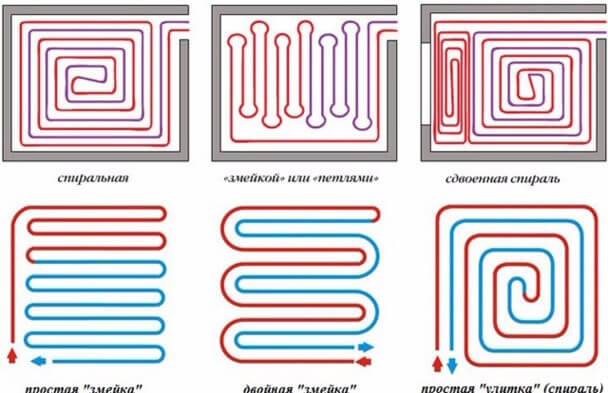 Tipul de buclă este foarte asemănător tipului de serpentină. Singura diferență este că spirala nu va fi simplă, ci dublă. În consecință, va trebui să folosiți puțin mai mult material. Cu această metodă, conductele și podeaua vor fi încălzite uniform.
