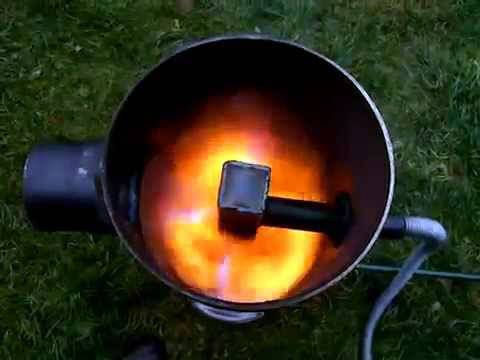 Uleiul uzat din partea de jos a recipientului este aprins prin adăugarea unei cantități mici de benzină sau mai subțire, apoi ventilatorul suflantei este pornit. După încălzire, combustibilul începe să emită activ vapori, care sunt arși cu un exces de oxigen. Rezultatul este o torță puternică de flacără care se răspândește în toate direcțiile, așa cum se vede în fotografie.