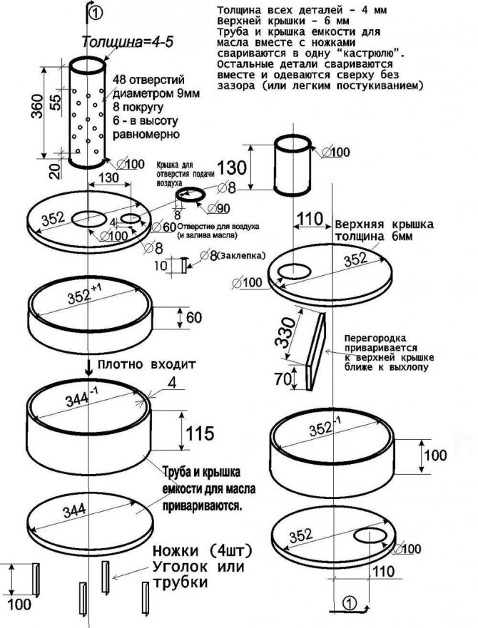 - Părțile compartimentului superior sunt sudate dintr-o țeavă cu un diametru de 352 mm și o înălțime de 100 mm. Fundul este sudat dintr-o tablă de oțel, în care este prevăzută o gaură pentru o țeavă perforată.